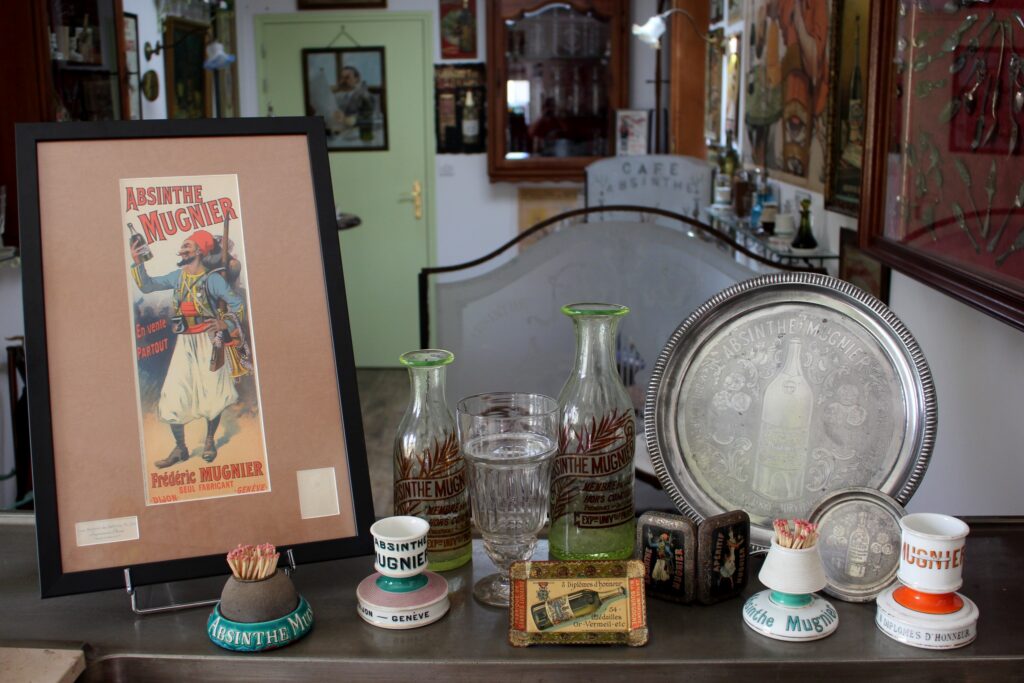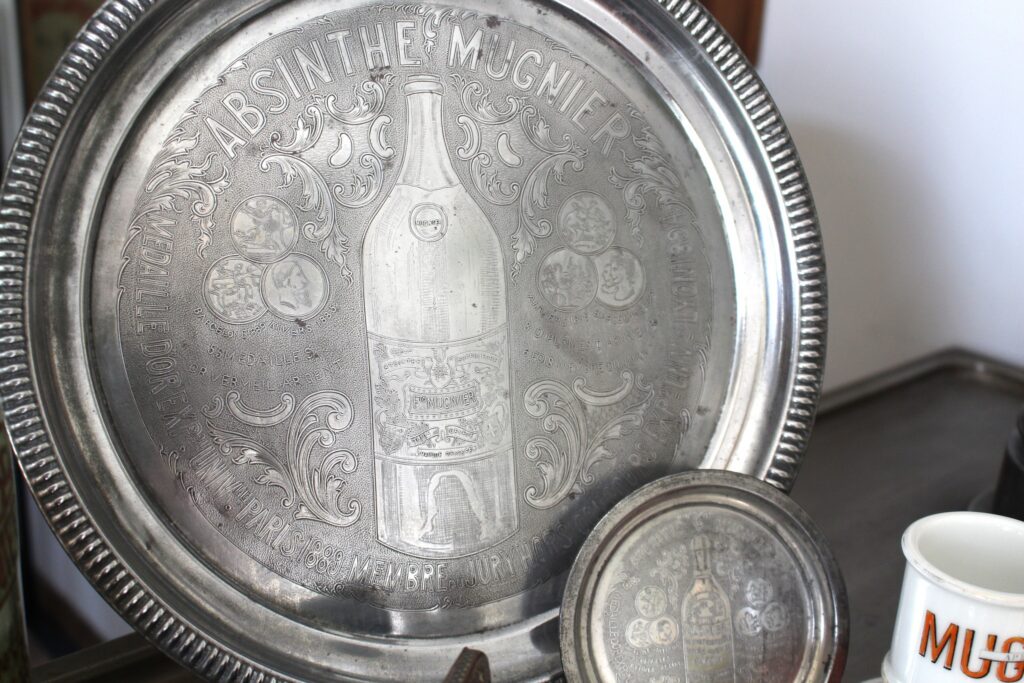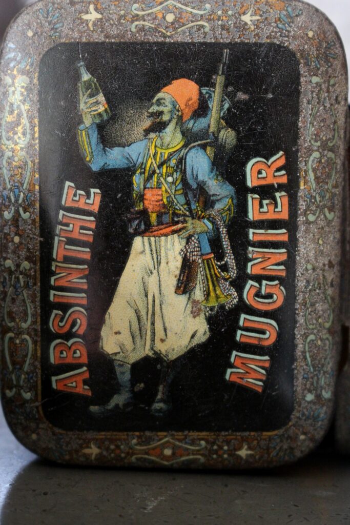 Frédéric Mugnier a installé sa fabrique de Liqueurs à Dijon en 1863 et profite de la demande croissante de cette nouvelle boisson apéritive pour distiller de l’absinthe. Sa publicité est très présente sur les objets de bistrot et son emblème le Zouave véhicule une image patriotique associé au coté thérapeutique de l’absinthe qui aurait contribué à la conquête coloniale.