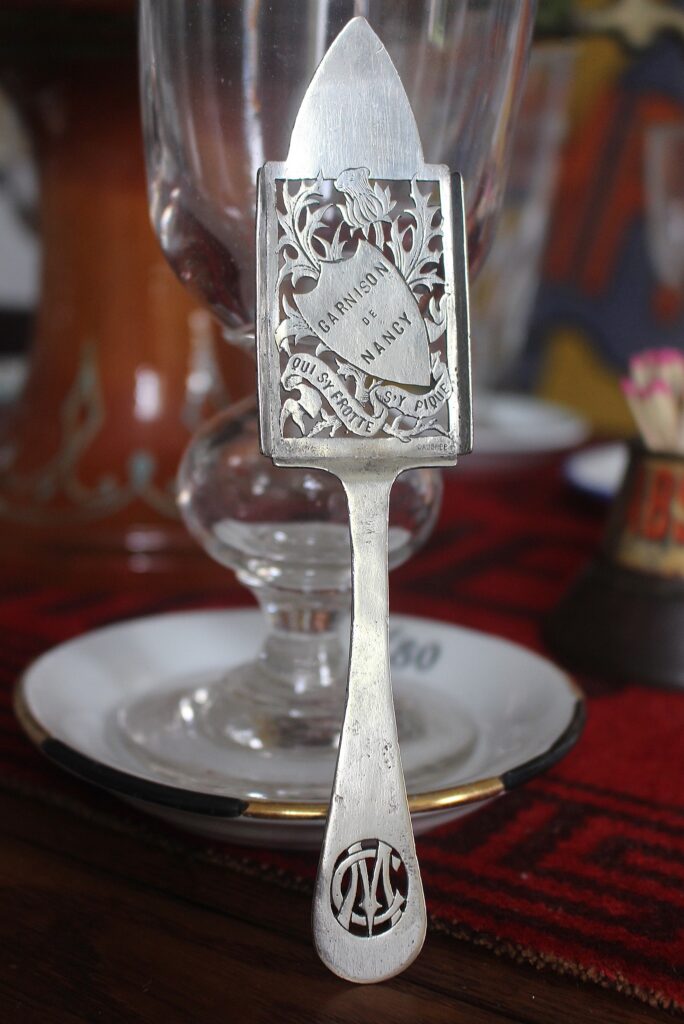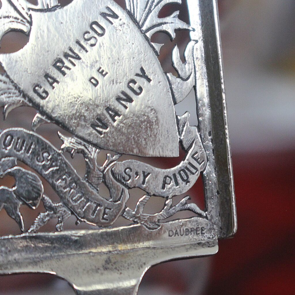 La cuillère Garnison de Nancy « Qui s’y frotte s’y pique » est une cuillère qui fut fabriquée pour le Cercle Militaire (CM) de la garnison de Nancy vers 1900 par la célèbre famille d’orfèvres nancéiens DAUBRÉE. Elle était utilisée au cercle militaire par les officiers de la garnison. On y voit le chardon, symbole de la Lorraine, rehaussé par la devise du 26ème régiment d’infanterie et par extension devise de Nancy.