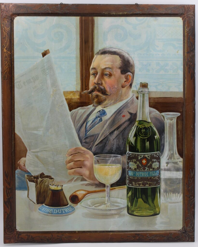 Dans le monde de l’absinthe, la tôle publicitaire occupe une place particulière. Les grandes distilleries rivalisent d’inventivité pour séduire le consommateur et affirmer leur notoriété. Certaines illustrations restent simples, présentant clairement la bouteille ou le nom de la marque. D’autres recherchent l’originalité : figures féminines incarnant la “fée verte”, scènes de café animées, compositions Art nouveau ou scènes de genre.
