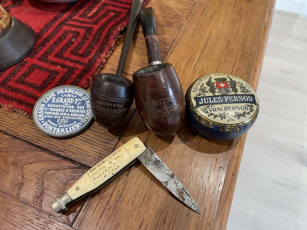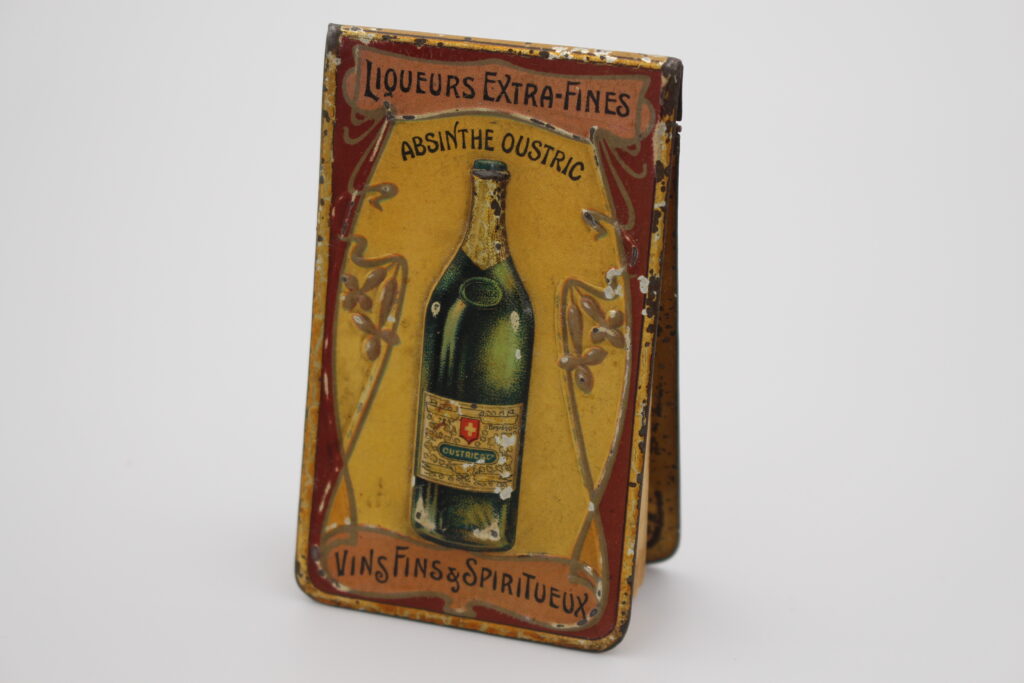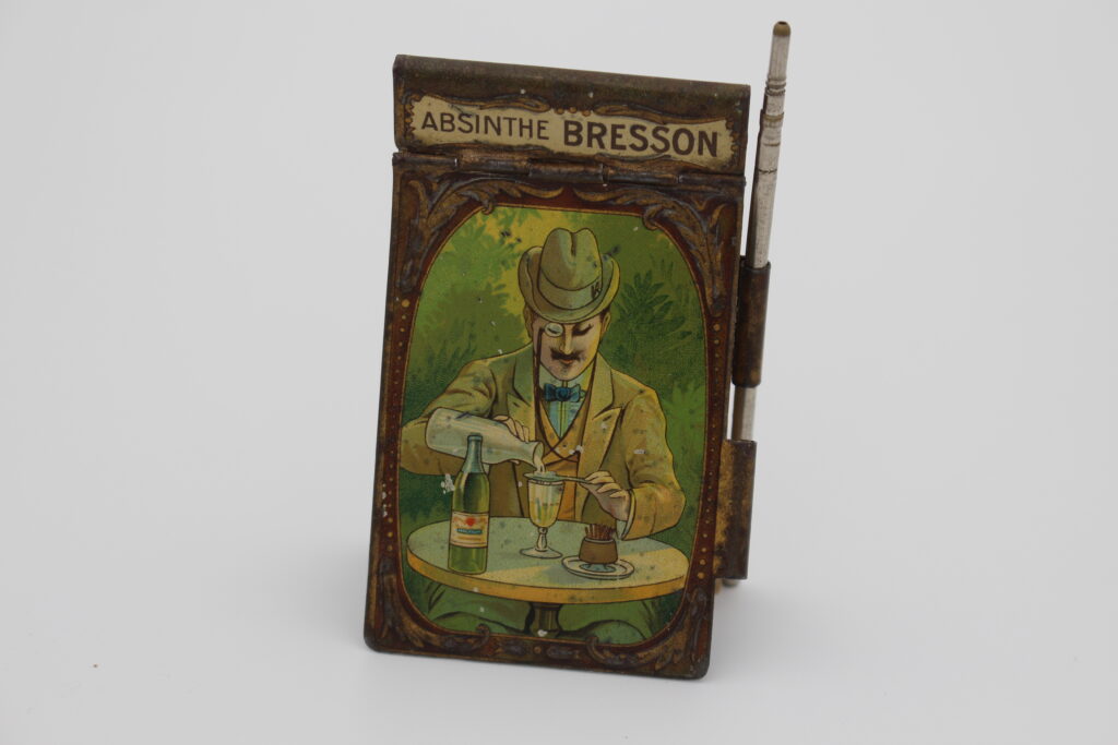 Petits objets publicitaires Les petits objets en tôle lithographiée Carnet en tôle lithographiée pour l’Absinthe Ouistric Carnet en tôle lithographiée pour l’Absinthe Bresson Objets de représentants