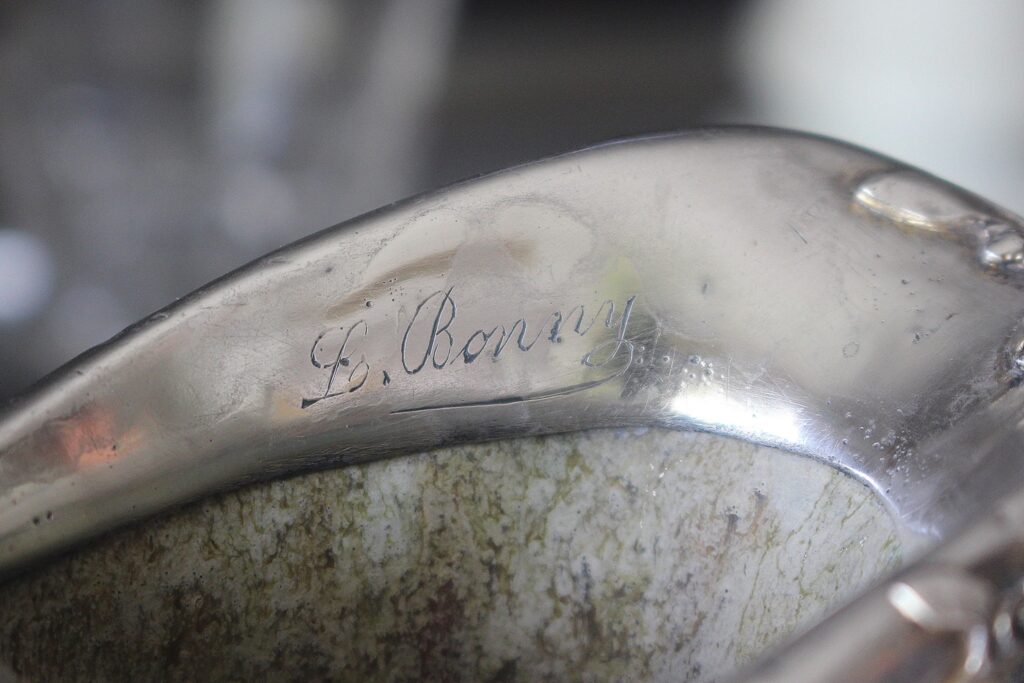 Quentin, en fin observateur, a repéré quelque chose que le vendeur et moi même n’avions pas remarqué. Une signature dans le métal! La coiffe est signée L.Bonny. La famille Bonny était orfèvre à Paris dans les années 1900.
